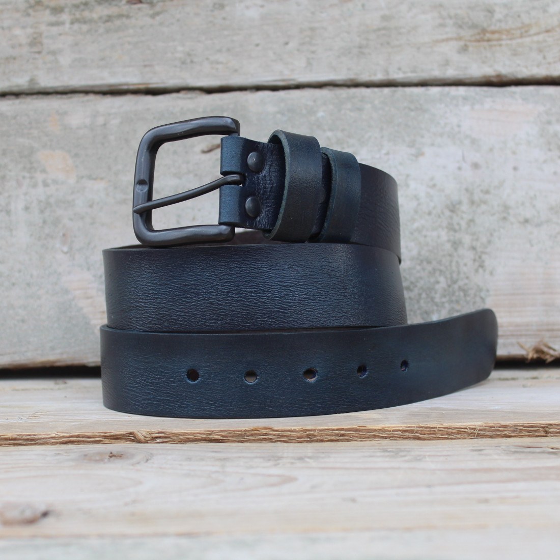 The design is grounded by a heavy black metal buckle and matching hardware, chosen to complement the depth of the indigo leather without overpowering it. Clean lines, strong materials, and thoughtful construction come together in a belt made for everyday wear — especially with denim.